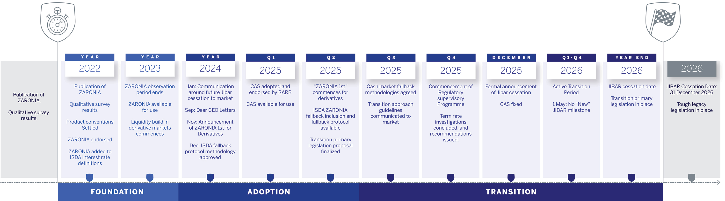 The Transition phase will kick off with the formal announcement of the JIBAR cessation date, expected in Q4 2025. This will be followed by the final publication of JIBAR (or JIBAR cessation) at the end of 2026 as depicted in the latest Industry Timelines.